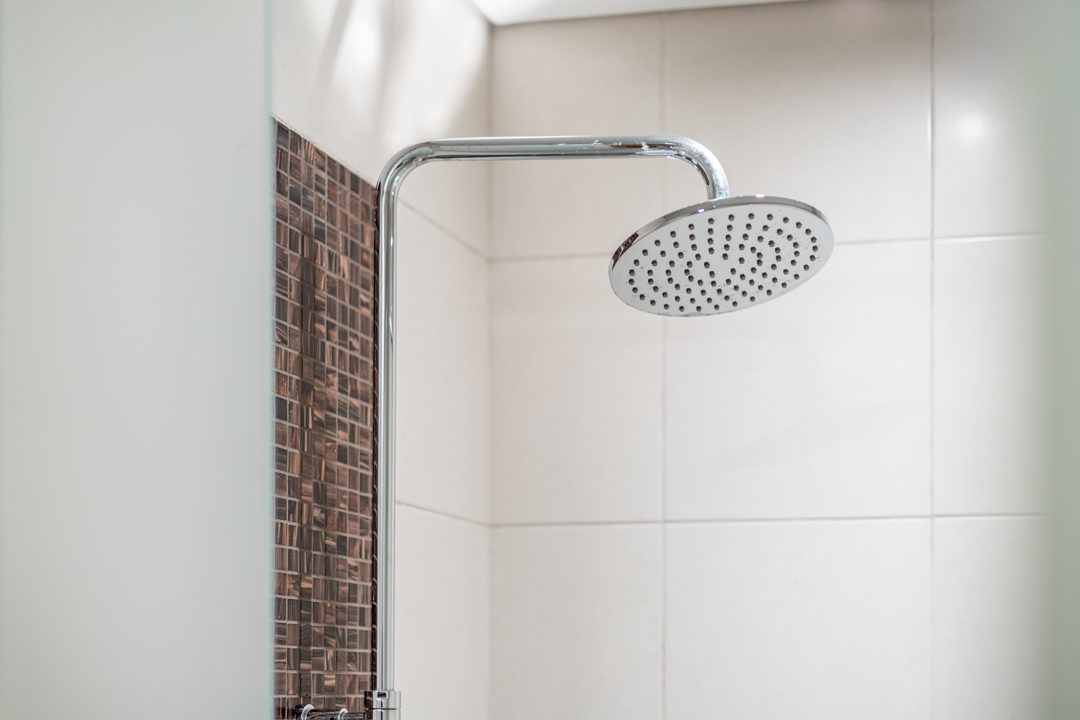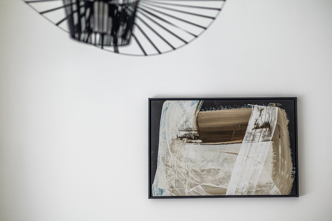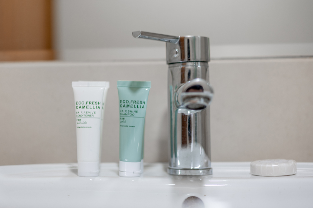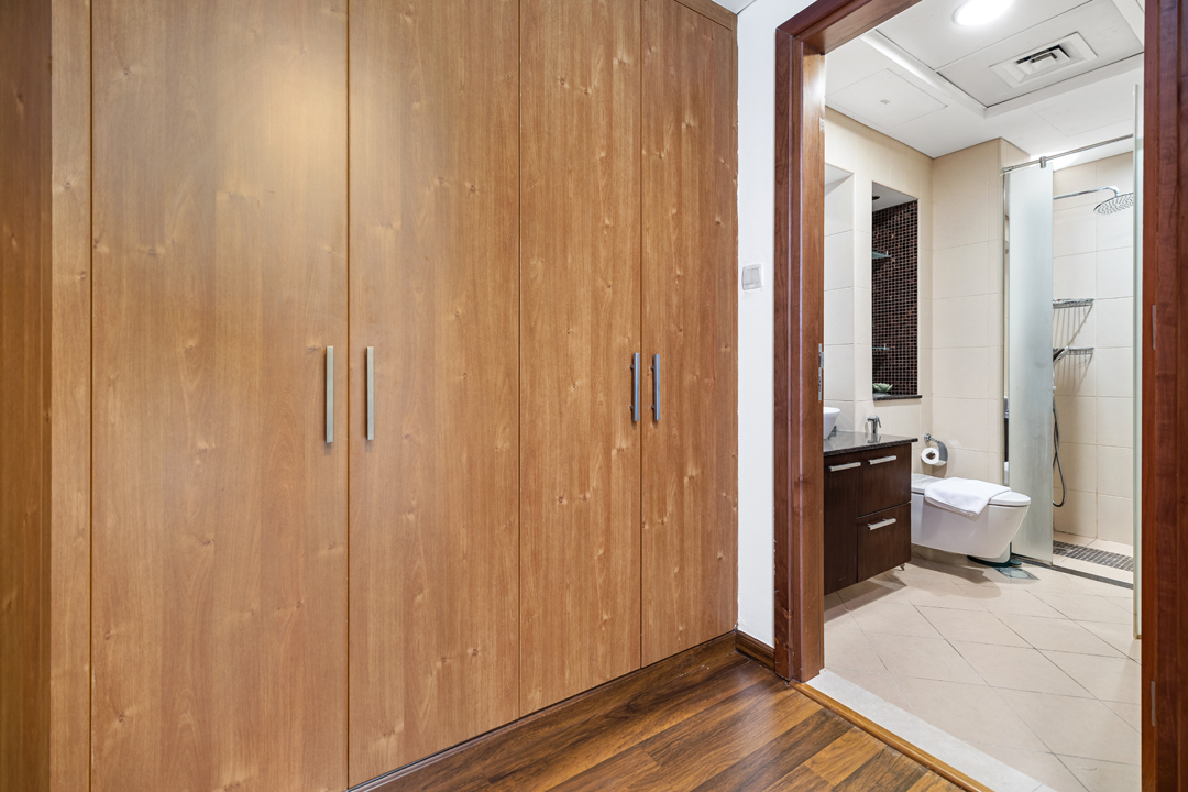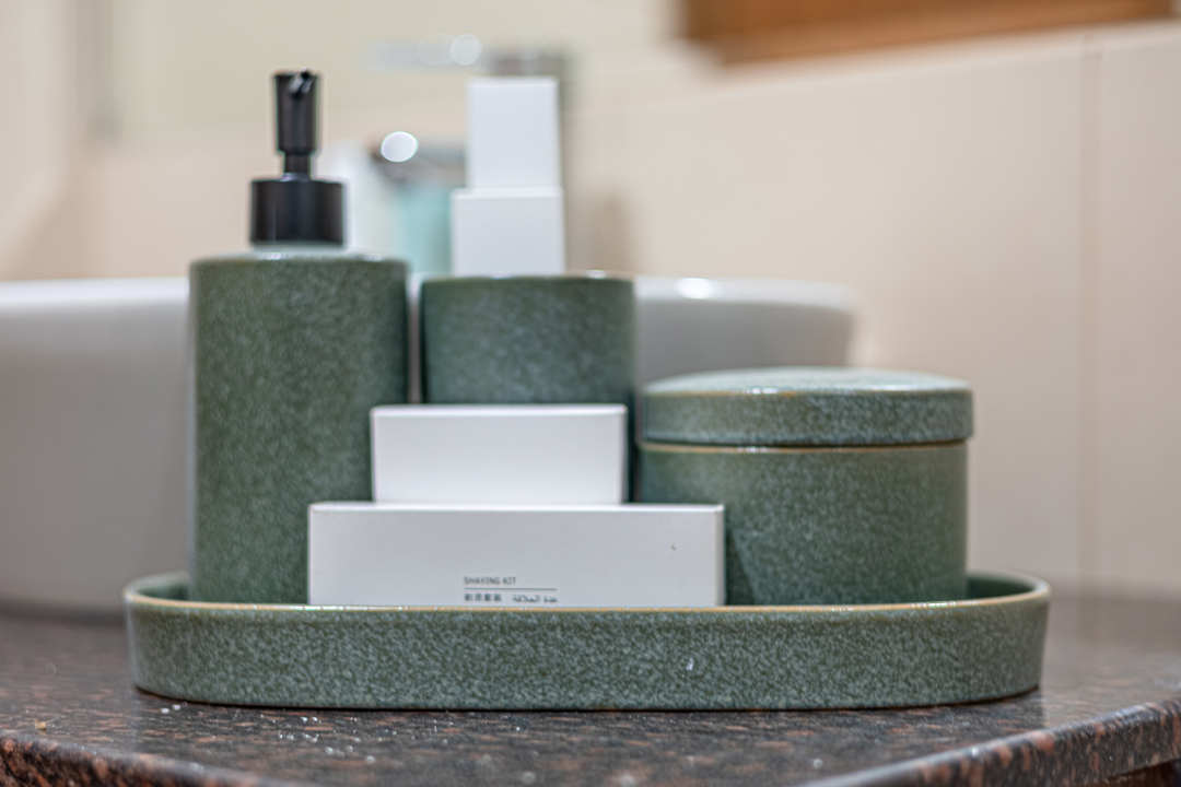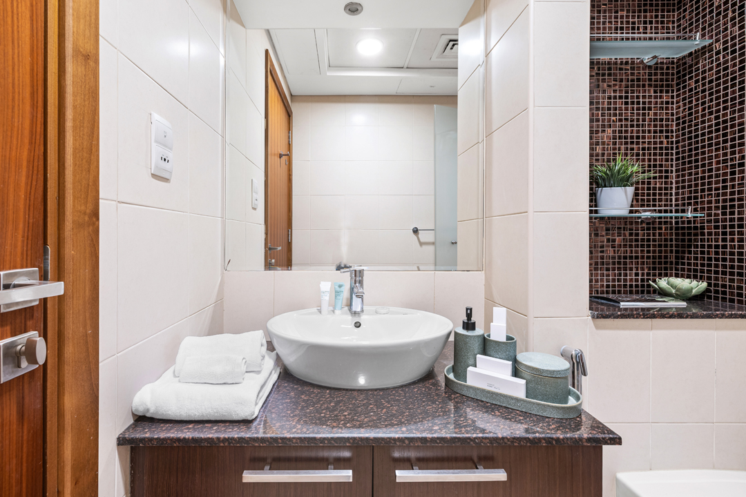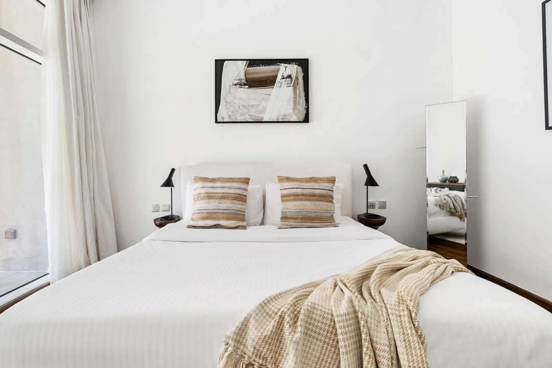 The bedroom is a calming retreat, furnished with a queen-sized bed, floor-to-ceiling wardrobes, and an en-suite bathroom with a walk-in shower and a thoughtfully curated set of aesthetic toiletries. For added convenience, there’s also a guest powder room outside the bedroom.