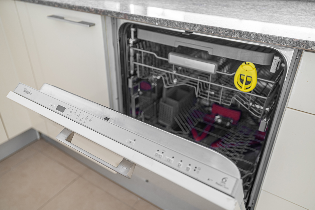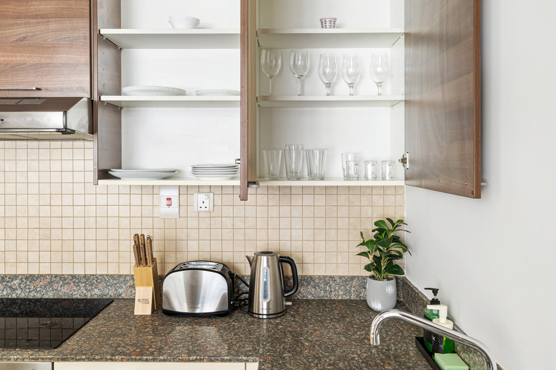 The open-plan layout features a cozy living area with a 2-seater sofa and Smart TV, seamlessly flowing into the island kitchen and dining space with a 4-seater dining set. The kitchen comes fully equipped with all the essentials—including cookware, cutlery, and even a dishwasher—making dining in easy and enjoyable.