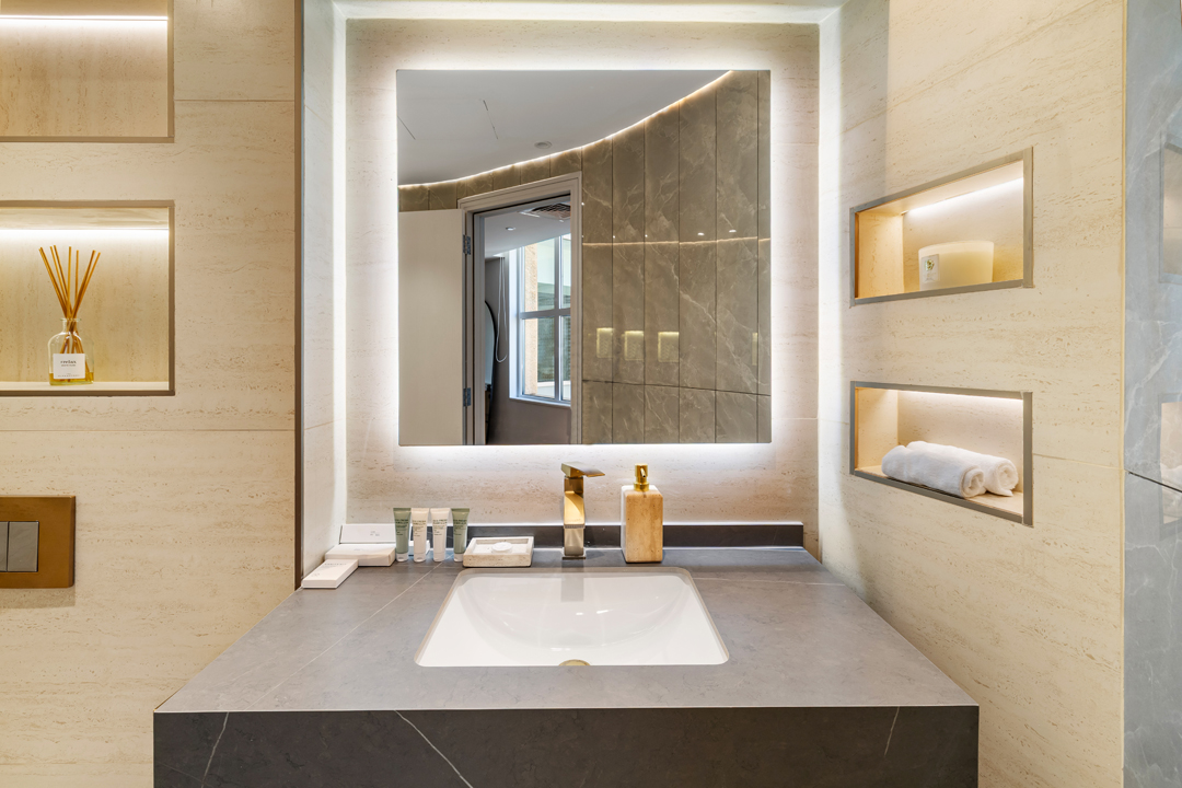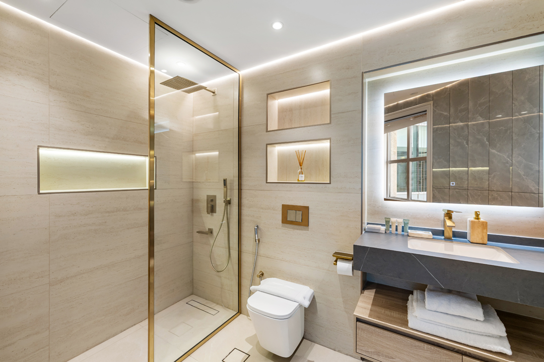 The space features a king-sized bed, a cozy sofa set, and a dedicated study desk, making it perfect for both relaxation and remote work. Enjoy meals at the 4-seater dining set or prepare your favorite dishes in the fully equipped kitchen with modern appliances and essentials. The upgraded washroom offers a sleek walk-in shower and a stylish LED mirror with changeable lighting, adding a touch of luxury to your daily routine.