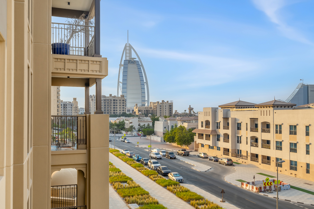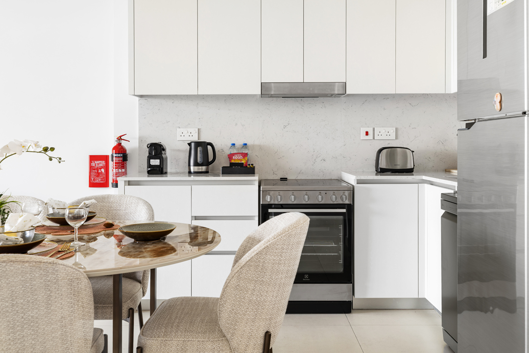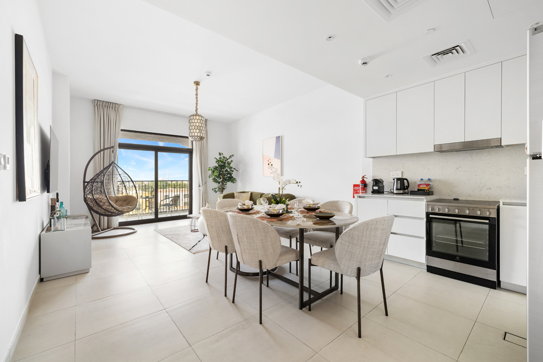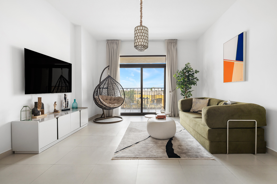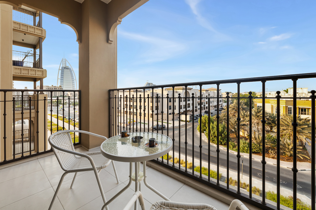 Experience modern comfort in this stylish 1-bedroom apartment at Jadeel 3, Madinat Jumeirah Living! Designed with white-toned furniture accented by olive green and vibrant décor, the apartment offers a cozy yet elegant atmosphere. The living room features a 2-seater sofa, a unique swing chair, a coffee table, and a smart TV, seamlessly connected to the fully equipped kitchen and dining area in an open layout that leads to the balcony. The bedroom comes with a king-sized bed, dresser, and floor-to-ceiling wardrobe, while the bathroom is fitted with a sleek walk-in shower. Step out onto the balcony furnished with a 2-seater set to enjoy relaxing community views of Jumeirah and a close glimpse of the iconic Burj Al Arab. Guests will also have access to premium building amenities including a shared pool, gym, and children’s playground, making it the perfect stay for both business and leisure in one of Dubai’s most sought-after neighborhoods.