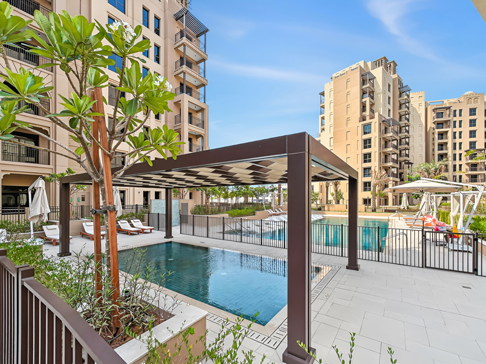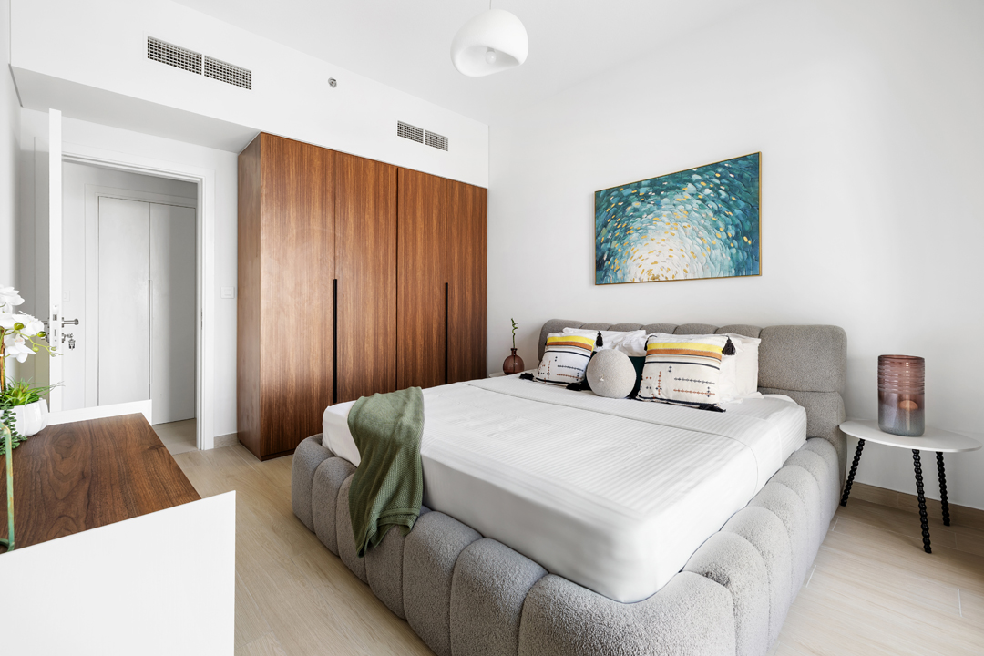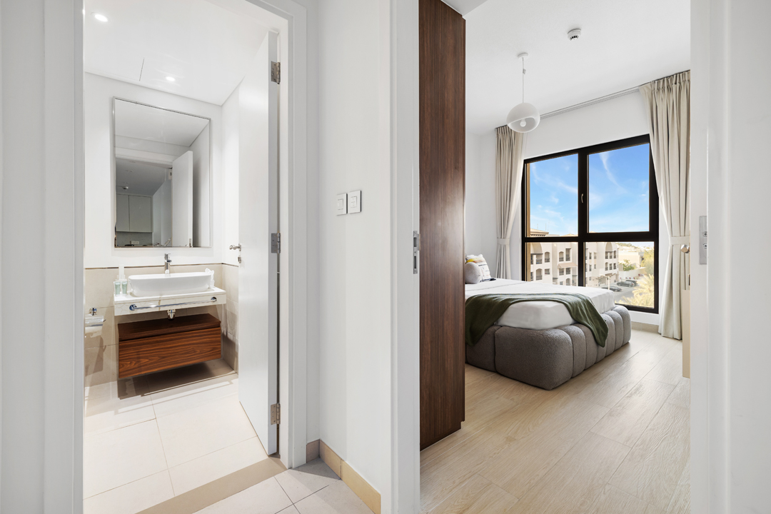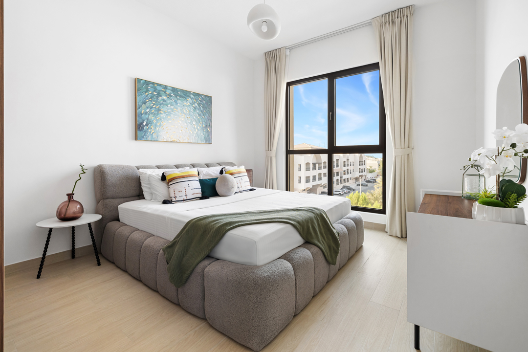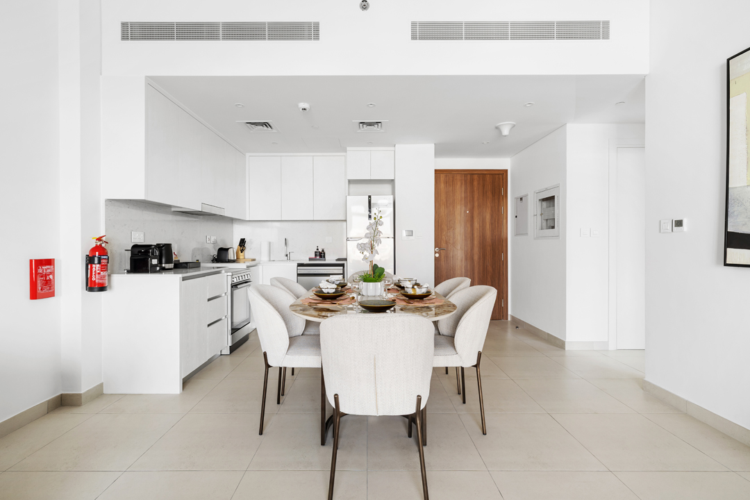 Experience modern comfort in this stylish 1-bedroom apartment at Jadeel 3, Madinat Jumeirah Living! Designed with white-toned furniture accented by olive green and vibrant décor, the apartment offers a cozy yet elegant atmosphere. The living room features a 2-seater sofa, a unique swing chair, a coffee table, and a smart TV, seamlessly connected to the fully equipped kitchen and dining area in an open layout that leads to the balcony. The bedroom comes with a king-sized bed, dresser, and floor-to-ceiling wardrobe, while the bathroom is fitted with a sleek walk-in shower. Step out onto the balcony furnished with a 2-seater set to enjoy relaxing community views of Jumeirah and a close glimpse of the iconic Burj Al Arab. Guests will also have access to premium building amenities including a shared pool, gym, and children’s playground, making it the perfect stay for both business and leisure in one of Dubai’s most sought-after neighborhoods.