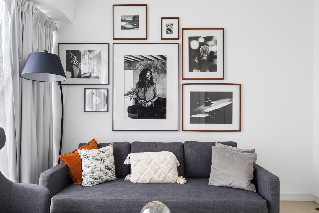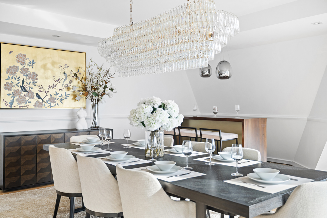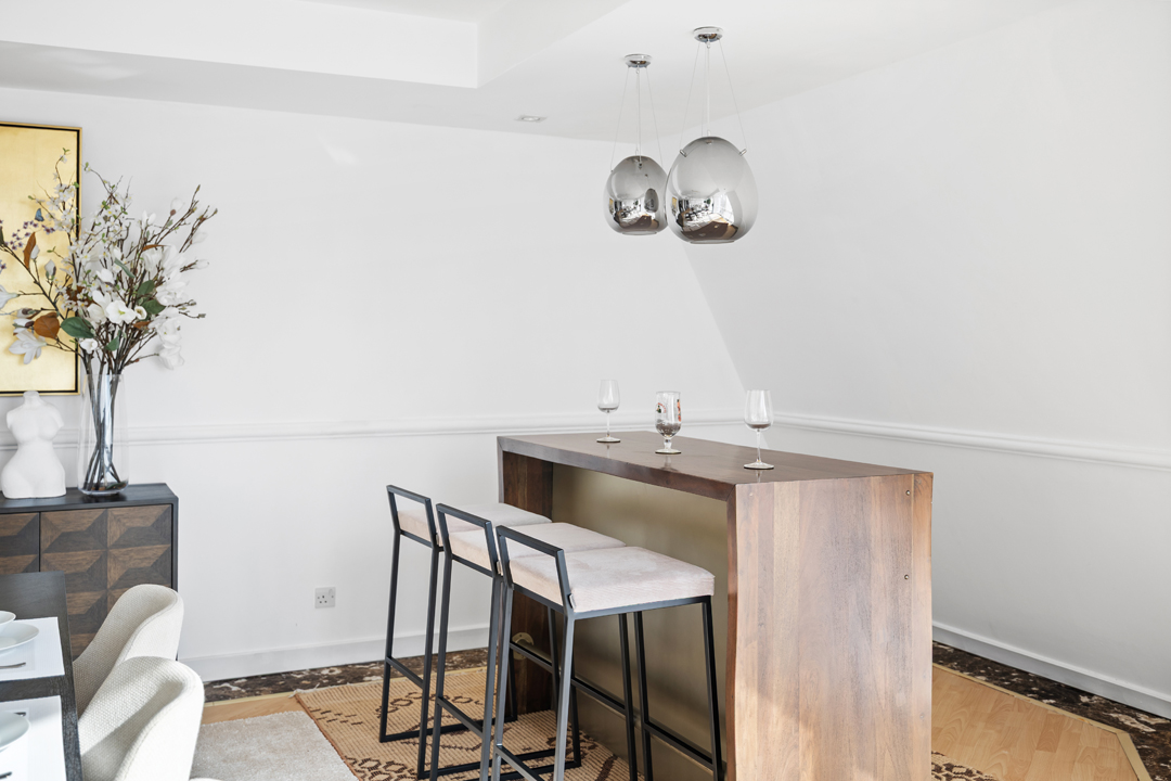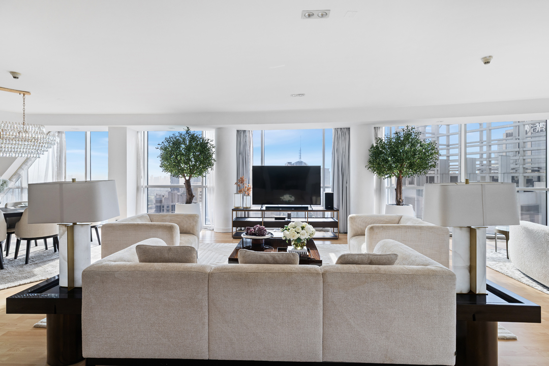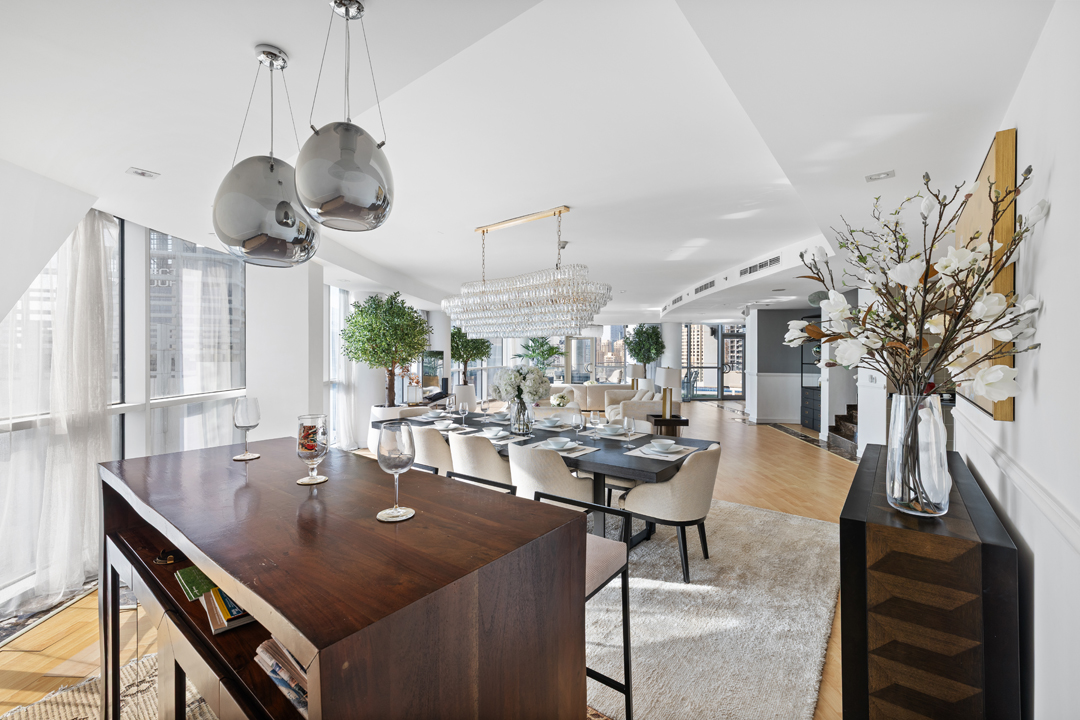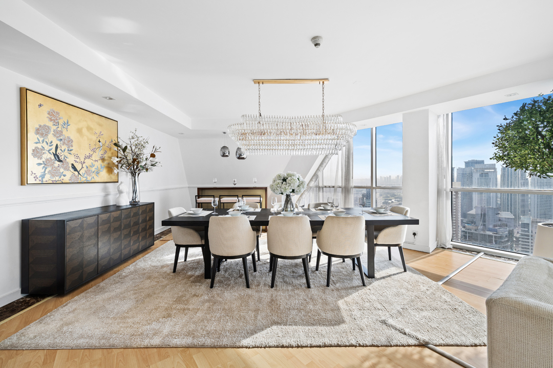The expansive living area is beautifully furnished with two plush sofa sets, a smart TV, and striking floor-to-ceiling windows that wrap the space in natural light while showcasing the vibrant Marina skyline. The open-plan layout flows seamlessly into a modern, mono-toned dining area comfortably seating eight guests, complemented by a stylish bar island—perfect for entertaining or relaxed evenings at home.