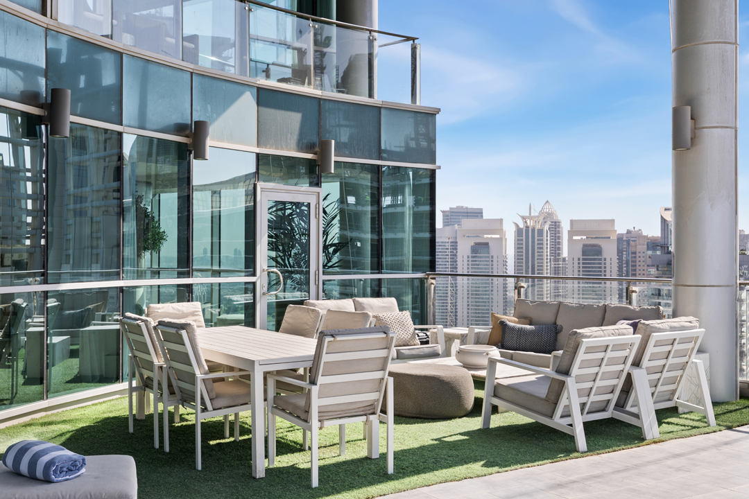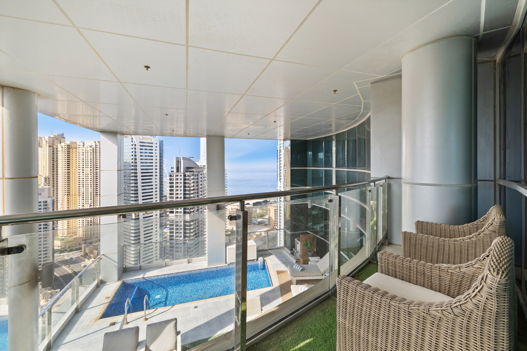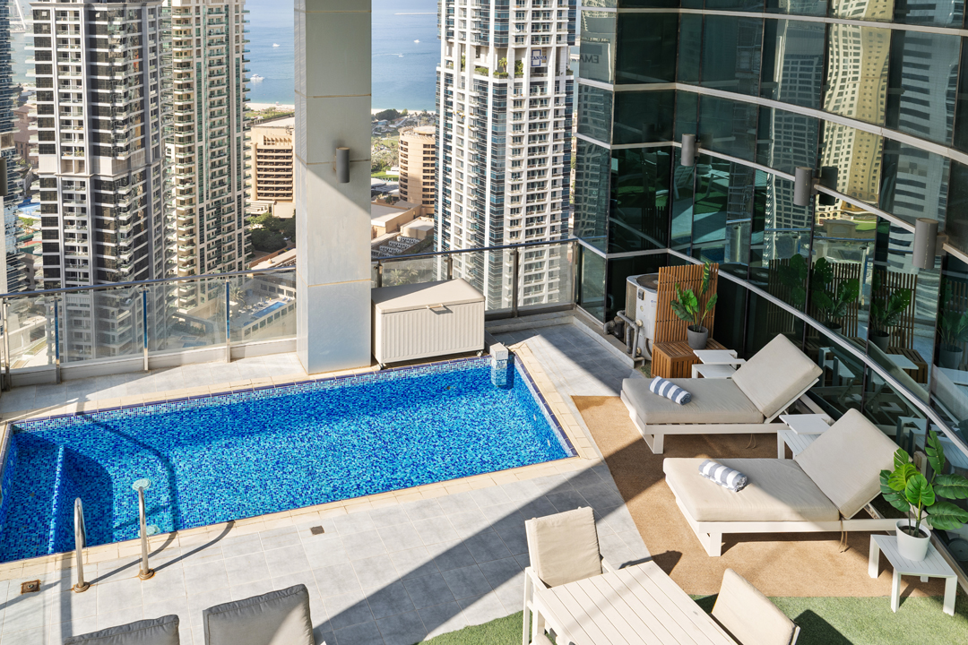 Step outside to your private pool terrace, a true highlight of the home, complete with sun loungers, outdoor seating, and a dining table set. From here, enjoy uninterrupted views of Dubai Marina’s waterways, city streets, and a stunning collection of luxury yachts docked below—an ideal setting for sunrise coffee or evening dinners under the city lights.