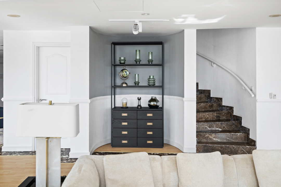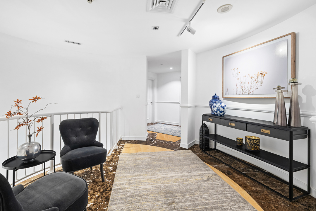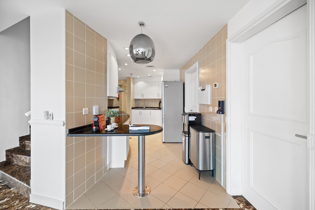 A well-positioned guest powder room is located on the main level, while the master bedroom on the first floor offers a truly elevated experience. Wake up to panoramic Marina views through a dramatic 90-degree remote-controlled curtain window, with the king-size bed perfectly facing the scenery. The suite also includes a cozy seating area with an elegant coffee table, a study desk, and a luxurious ensuite bathroom featuring a bathtub and walk-in shower.