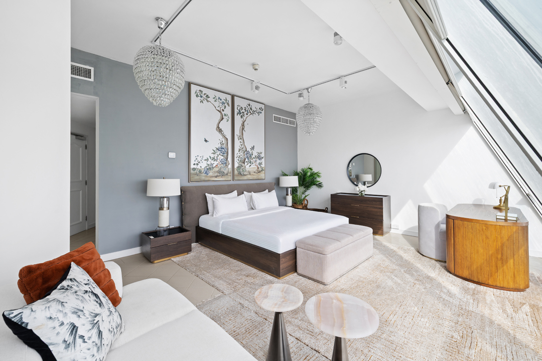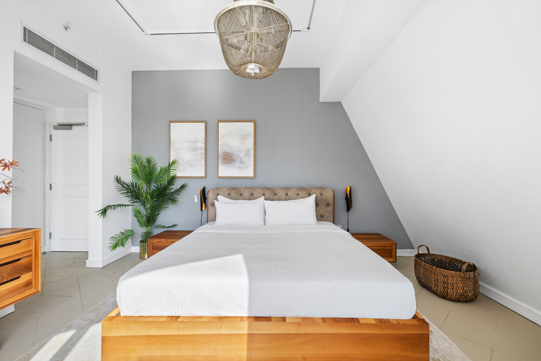 Upstairs, you’ll find three additional bedrooms along with a dedicated theater room. Upon reaching this level, two thoughtfully designed seating areas with consoles provide extra spaces to unwind. The second bedroom features a queen-size bed, study desk, and access to a furnished balcony overlooking your private pool and the Marina. Its ensuite bathroom includes a bathtub with shower and a separate walk-in shower.