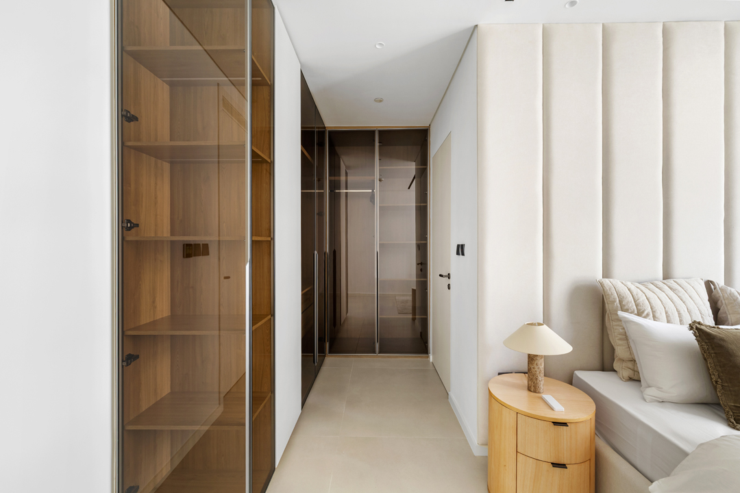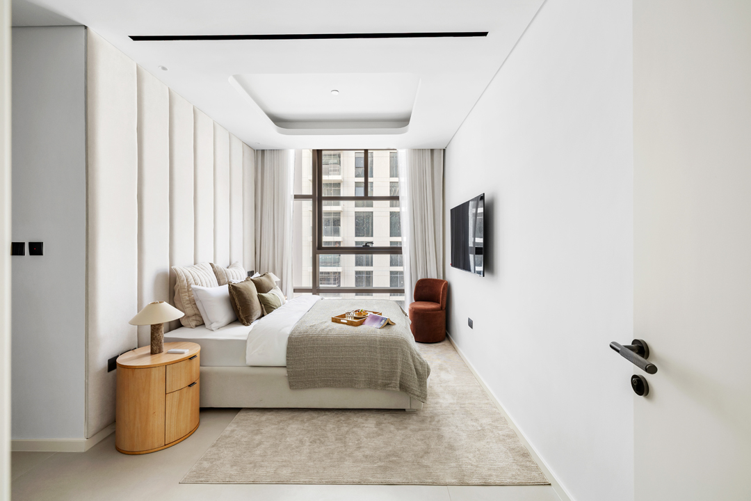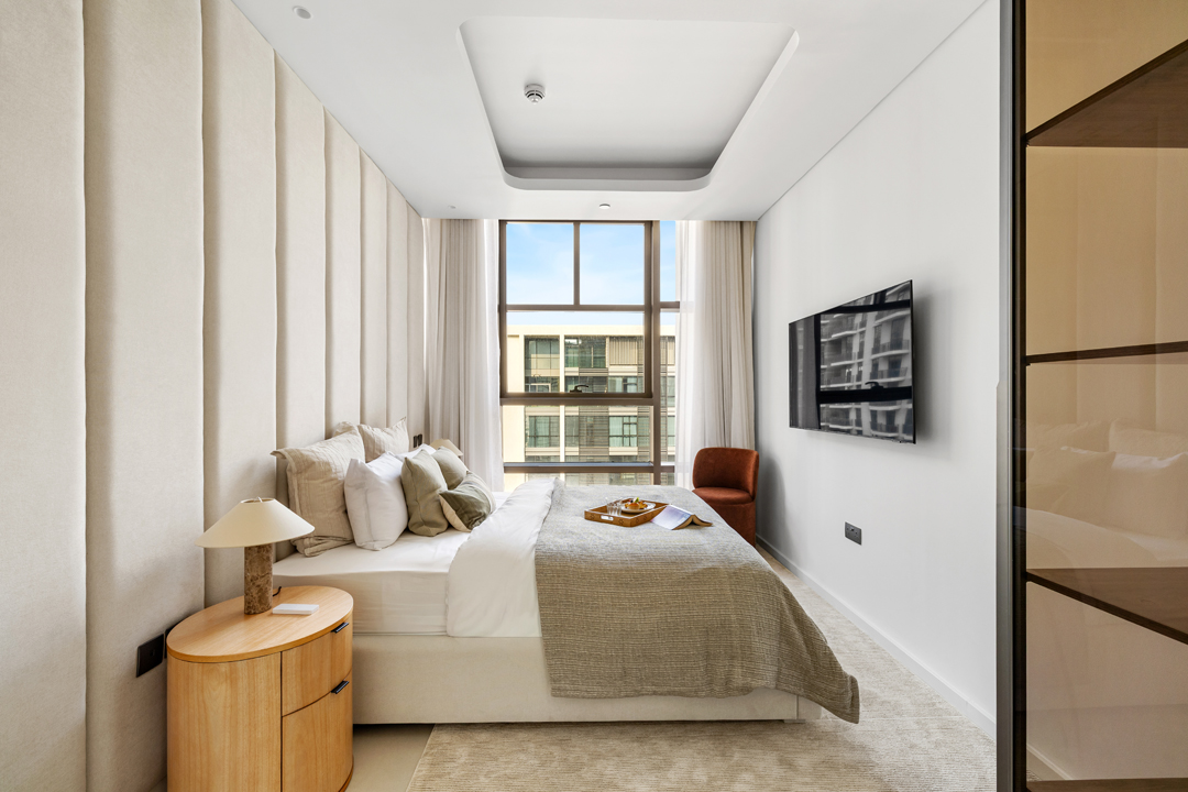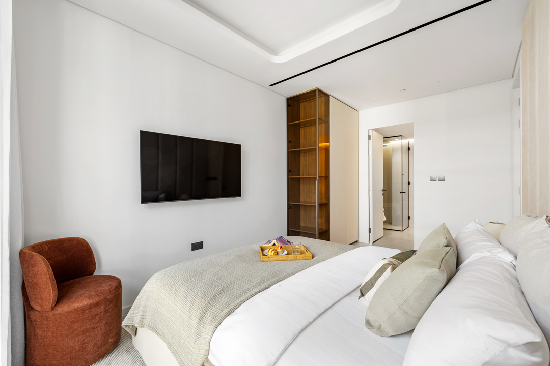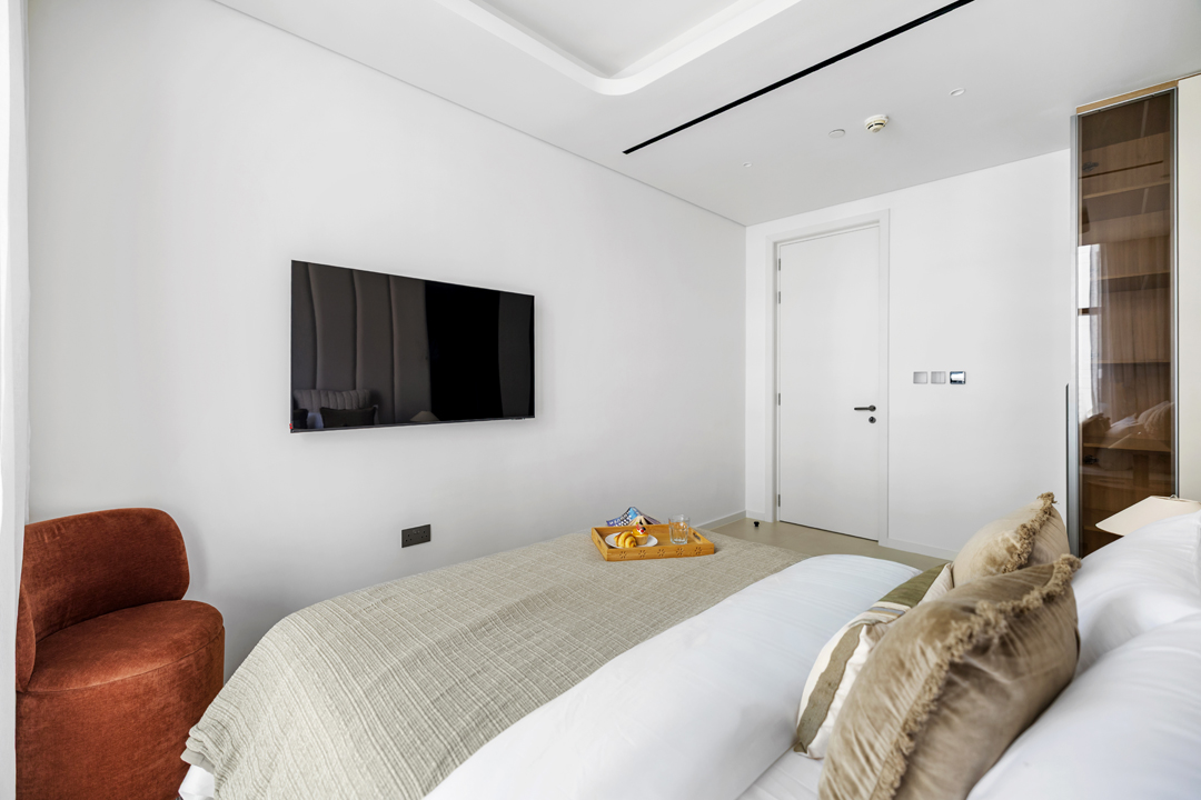 The master bedroom boasts ample wardrobe space, an ensuite bathroom and a smart TV, while the second bedroom also includes generous storage, an ensuite bathroom with a bathtub, and smart TV. The third bedroom offers spacious wardrobe storage and easy access to shared facilities.