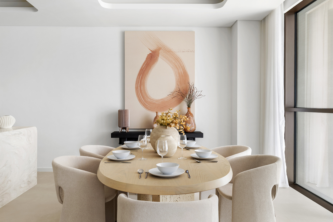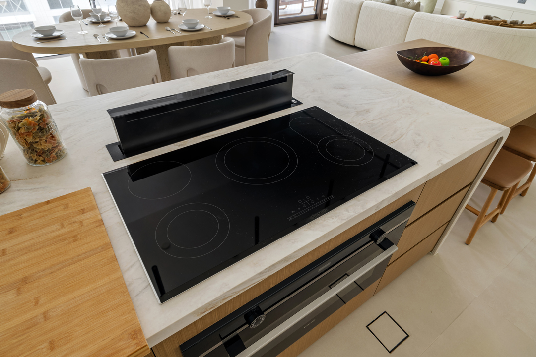 This newly furnished home features an open-layout living and dining area complemented by elegant wood, marble, and white finishes, a large smart TV, and a fully equipped modern kitchen with a stunning upgraded island—perfect for entertaining or relaxed family meals.